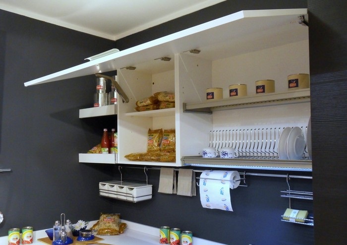 Materials: Cuisine cm.253 x 243 with bases in Matrix melamine finish gray. Cabinet and shelves in white melamine finish Matrix. Top and backsplash White Okite quartz absolute. Zero chemistry finish aluminum handles. The doors are also available in light oak, teak, oak, gray, cream, white oak, wenge, walnut, cherry and marbella with aluminum frame and panel in wood or glass.